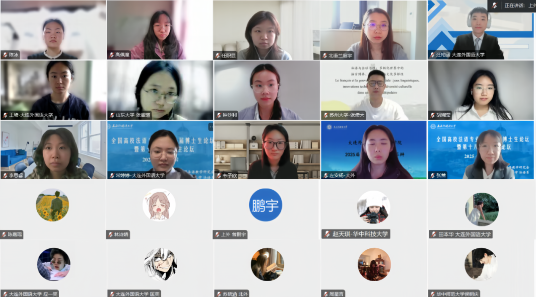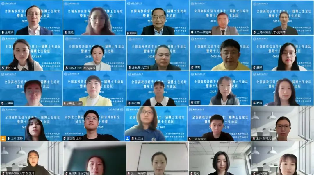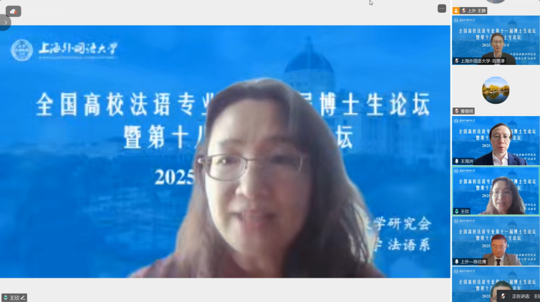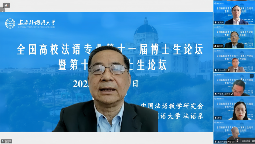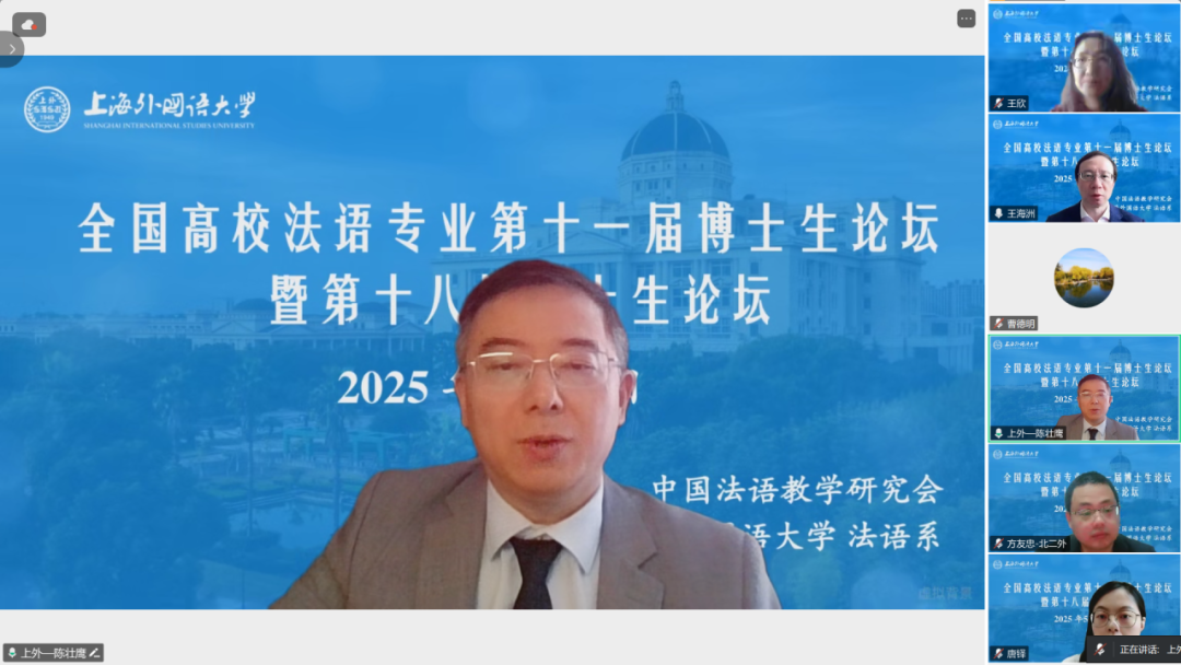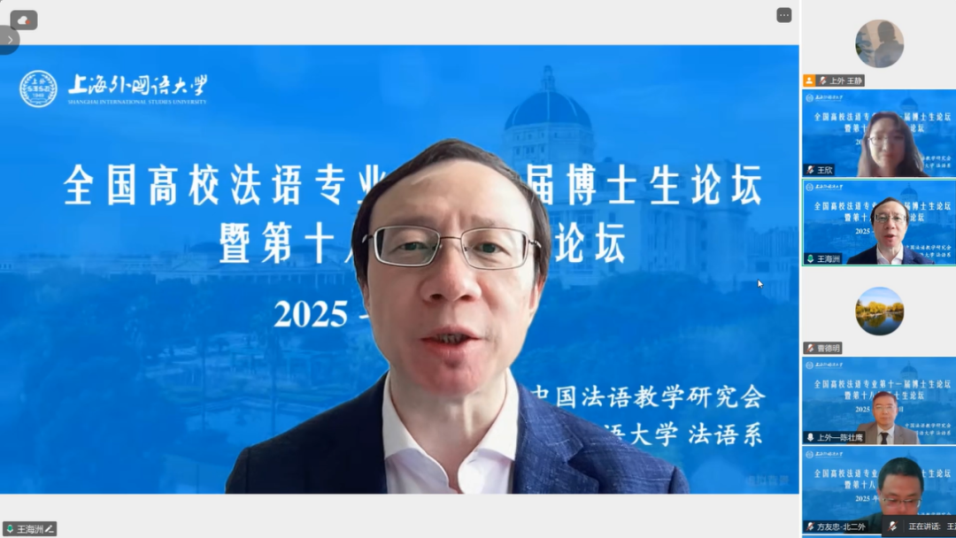 2025年5月10日,由中国法语教学研究会和上海外国语大学法语系联合承办的全国高校法语专业第十一届博士生论坛暨第十八届硕士生论坛以云端会议形式圆满举行。上外法语系主任王海洲主持开幕式,上海外国语大学副校长王欣、中国法语教学研究会会长曹德明和上外研究生院院长陈壮鹰等领导出席并致辞。
