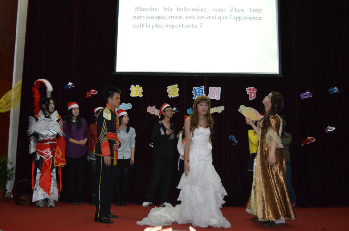 改编的最高潮当属大二四班的《白雪公主奇遇记》,同学们大胆的反串不仅笑料十足更是凸显了出众的演技。当王子遇上为救猎人的女友而死去的公主,一曲深情的歌曲不仅使公主起死回生,更让观众痴迷。这样大胆的改编不仅考验了同学们的演技,更是对同学们法语水平的考验。最终大二四班不负众望,夺得第一。