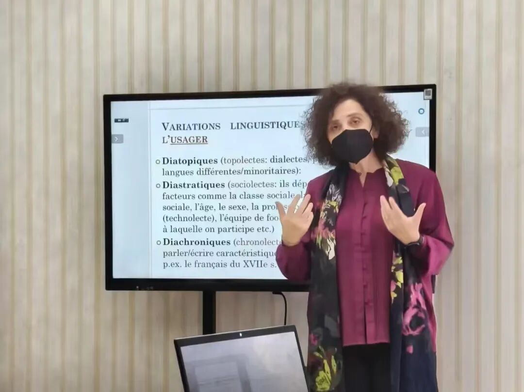 Tsigou教授首先指出,语言本质上是多样的——不同地域、社会阶层、年龄、职业、乃至具体语境都会影响人们的表达方式。通过援引安德烈・马丁内(André Martinet)迈克尔・韩礼德(Michael Halliday)的功能语言学理论,她向大家介绍了语言变体的多种类型,包括地域变体(diatopique);社会变体(diastratique);时间变体(diachronique)和语体变体(diaphasique),同时介绍了法国的语言地域分布,展现了法国语言文化的丰富性。