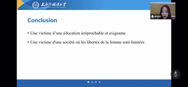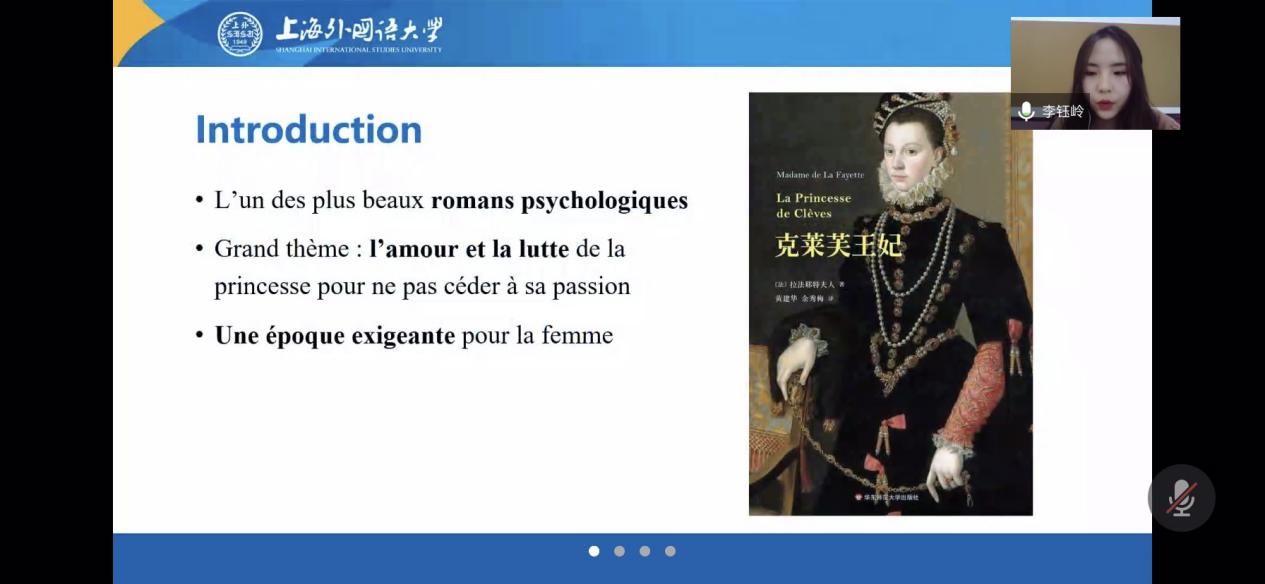 第一位进行学术分享的是来自法语系2017级的李钰岭同学,她也入选了卓越学院高级翻译人才实验班。在这次线上学术角活动中,她分享了自己对文学作品《克莱芙王妃》的研究心得。
