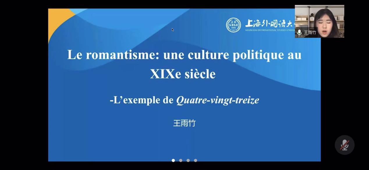在分享中,王雨竹同学诠释了自由主义与浪漫主义之间的联系,通过对《九三年》的引用与分析,得出了文学源于政治、反映政治并最终可以高于政治的结论。