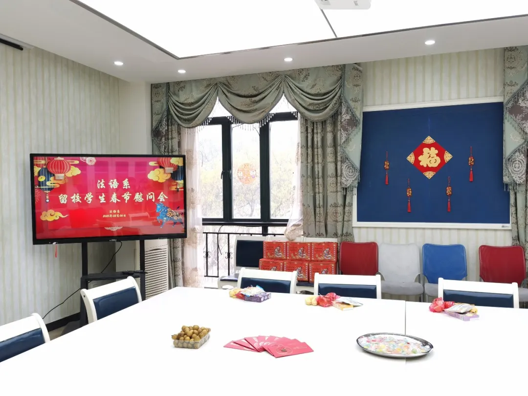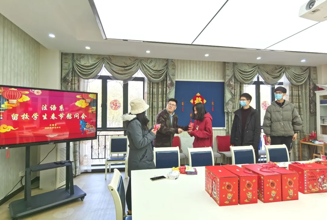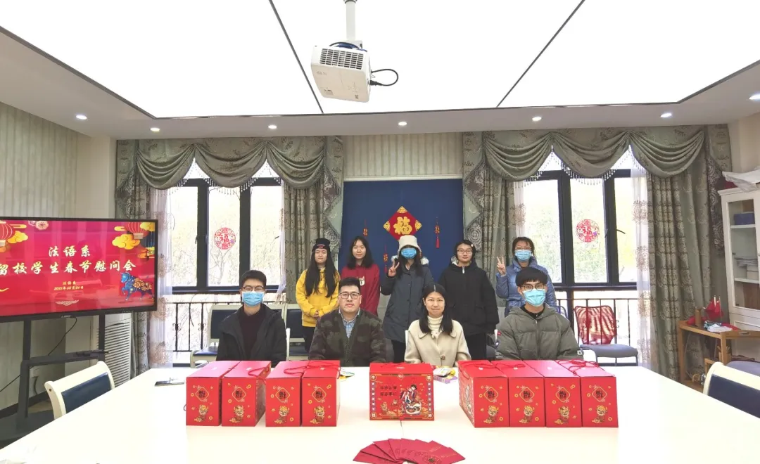2021年2月6日上午,法语系留校学生新春慰问活动在松江校区242会议室举行。法语系党总支书记忻炯俊、副书记陈雪莲、辅导员颜姝婷参与本次慰问,为留校学生送上浓浓暖意。
