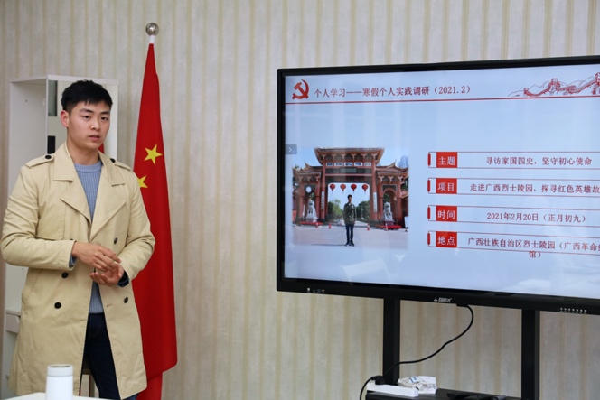 积极分子蓝圣祥同学以“党史中的红色英雄故事”为题进行了分享,介绍了中国共产党广西地方组织的建立和发展,展现出了历史长河中中国共产党不屈不挠的奋斗历程。
