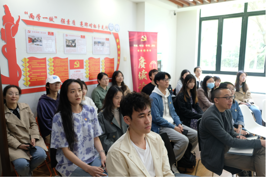 学生党员刘一彤的分享主题为“渔阳百年,星火相传”。他向大家展示了老渔阳里作为党的诞生地的历史,讲述了马克思列宁主义如何在一幢小小的老楼里萌芽、生长。随后,他又为大家讲述了新渔阳里的故事,分享了社会主义青年团在这里的诞生、上海外国语学社在这里的学习生活。“我们作为外语学习者,外国语学社就像我们的先驱一样。外国语学社的学生不仅学习外语,同时学习马克思主义基本原理,学习《共产党宣言》,并且参加各种各样的革命活动,同时还把中国的思想、中国的文化以及中国的故事带到世界各地,他们也是我们的先驱。”刘一彤同学如是说。最后,他满怀激情地以一段法文版《共产党宣言》片段朗诵结束了分享。