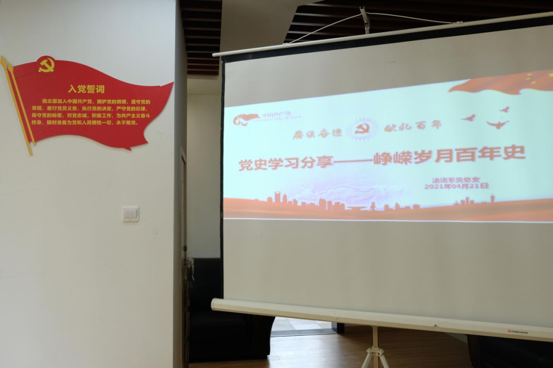 4月22日中午,法语系“赓续论坛”学生党课“大家说”第二讲在法语系党员之家如期举行,本次党课以“峥嵘岁月百年史”为主题,2018级学生党员刘一彤、王蕴宜分别围绕百年渔阳里、中共留法支部历史进行党史学习分享。法语系教工支部书记郑理、专职组织员张艳老师参与讨论。本次论坛由党员教师颜姝婷主持。