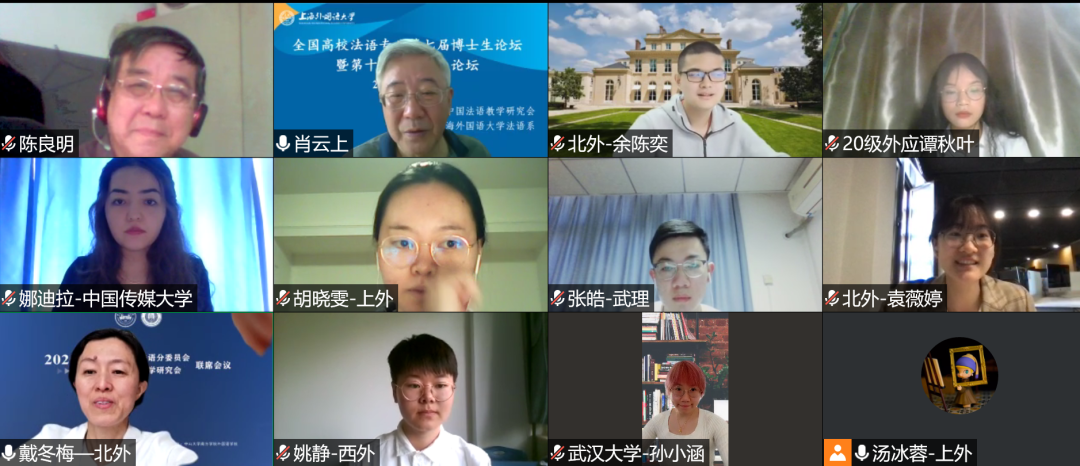本次论坛以“后疫情时代的法语世界:挑战和机遇”为主题 ,共设一个博士分论坛以及文学、国别区域和语言翻译等三个方向的硕士分论坛。组委会共收到来自海内外高校研究生参赛论文60余篇,经初审后共30多篇入围。5月9日,来自北京外国语大学、北京语言大学、大连外国语大学、对外经济贸易大学、复旦大学、广东外语外贸大学、华东师范大学、南京大学、南京师范大学、山东大学、上海外国语大学、苏州大学、武汉大学、武汉理工大学、西安外国语大学、浙江大学、中国传媒大学、中国人民大学和巴黎新索邦大学等19所高校法语专业近60位专家学者与硕博研究生齐聚云间,进行了深入的交流和研讨。