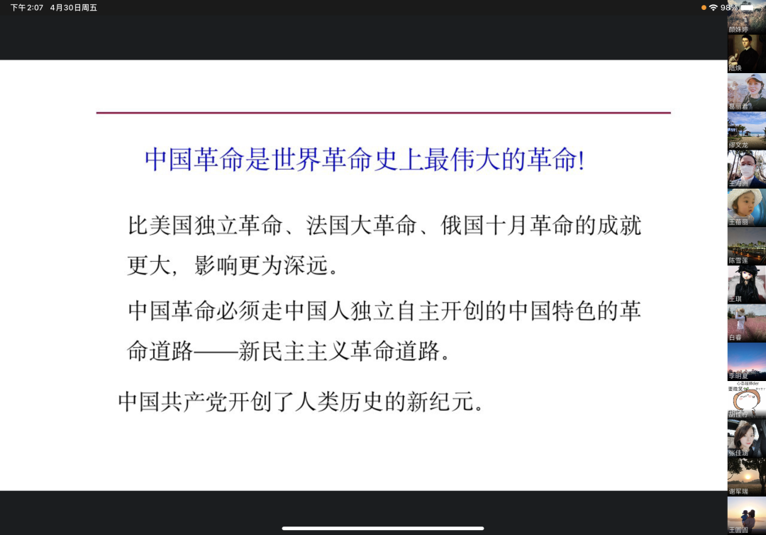 在随后的讨论环节,党员教师积极发表学习体会。刘常津老师在发言中表示,通过本次党课再次深刻体会到中国共产党党史是一部波澜壮阔的奋斗史,体现了我党与时俱进、艰苦奋斗、自我革新的优良品质。陈雪莲老师在发言中表示,在建党100周年之际,学习党的历史有着深远且重大的意义,法语系分党校和学生支部将扎实组织党史学习教育,使入党积极分子和党员们不断从党的百年奋斗史中汲取前进动力。