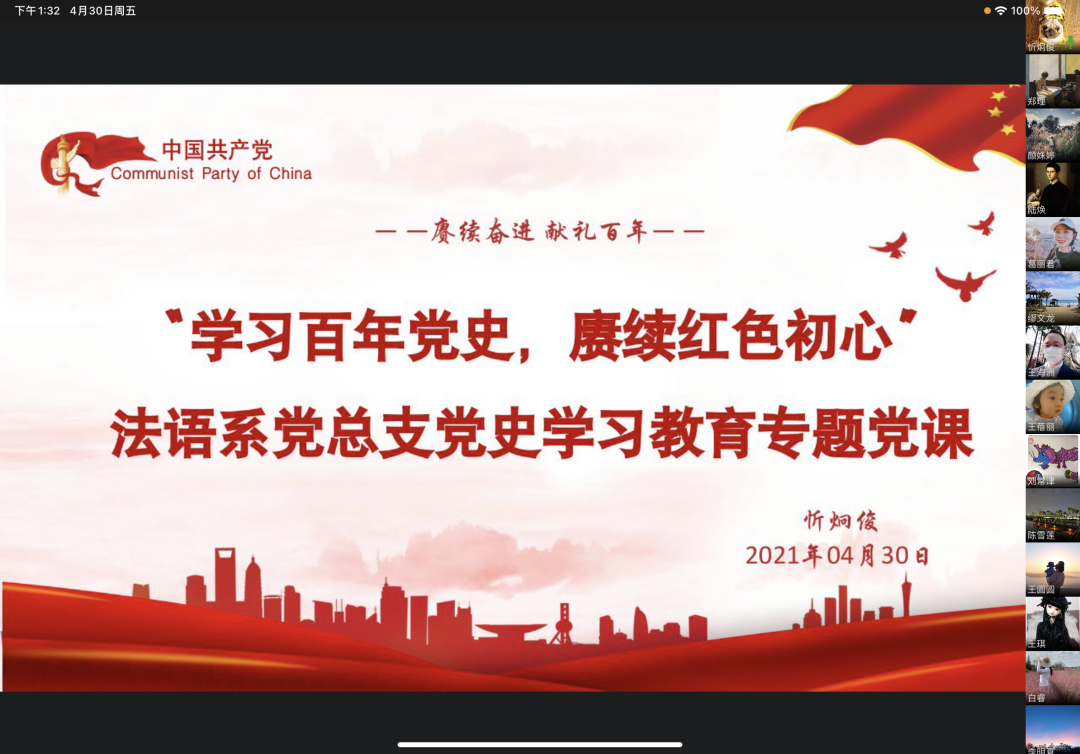 4月30日,法语系教工党支部以语音会议形式召开“赓续论坛”教工党课“开讲啦”第二讲,系党总支书记忻炯俊为支部党员做主题为“学习百年党史,赓续红色初心”党史学习专题报告。