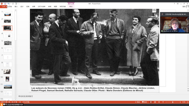 Bertrand教授首先简述了“新小说”的发展历程、代表作家和创作特点。二战后,,以阿兰·罗伯-格里耶(Alain Robbe-Grillet)、娜塔丽·萨洛特(Nathalie Sarraute)、克劳德·西蒙(Claude Simon)、塞缪尔·贝克特(Samuel Beckett)和玛格丽特·杜拉斯(Marguerite Duras)为代表的作家群体,创作出一批颠覆传统小说美学规范的作品。“新小说”原本是批评者用来嘲讽这些作品的戏称,后来则成为这批作家自我标榜的旗号。