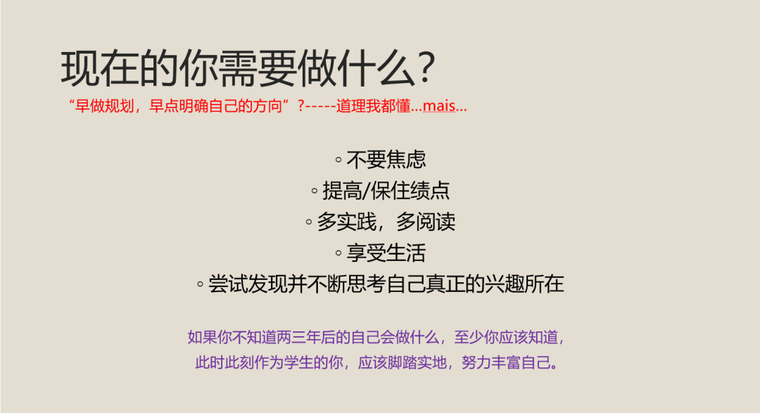另外,在学姐看来,过度执着于“早做规划”反而会让自己更迷茫。现阶段同学们无需过于焦虑,不妨在保证绩点的同时多实践、多阅读,不断思考和尝试,发掘自己真正的兴趣所在。