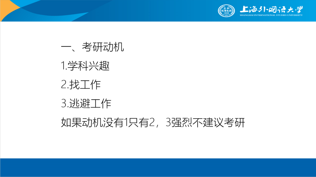 之后,刘宇欣学长从考研动机、学校和专业选择、学习计划安排及心态调整四个方面分享了他的考研经验。学长认为,考研应当出于自己的学术兴趣而非逃避就业或是单纯地为了找工作。在学校和专业的选择上,学长建议要选择自己感兴趣的专业并进行自我评估,选择能力范围内的学校。最后,学长提到,既然决定考研就要全身心投入,在备考时切忌三心二意,患得患失。