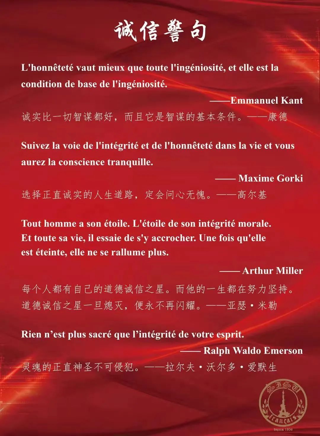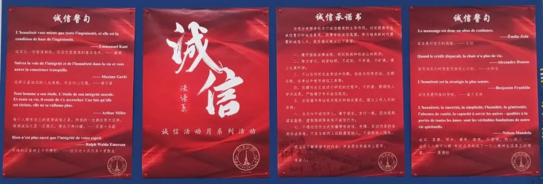 古人云:“人无信不立。”诚实守信一直是中华传统美德,也是当代社会主义核心价值观的要求之一。法语系将继续弘扬并贯彻对广大学生的诚信教育,为祖国培养一批批德才兼备的社会主义建设者和接班人。