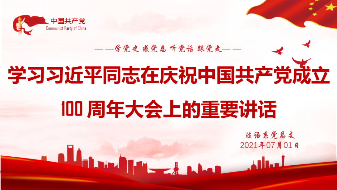 习近平总书记表示,中华民族迎来了从站起来、富起来到强起来的伟大飞跃,实现中华民族伟大复兴进入了不可逆转的历史进程。法语系全体党员将始终牢记总书记的讲话精神,同心向党、奋勇争先,从百年党史中汲取奋进力量,为实现中华民族伟大复兴的中国梦继续努力贡献力量!