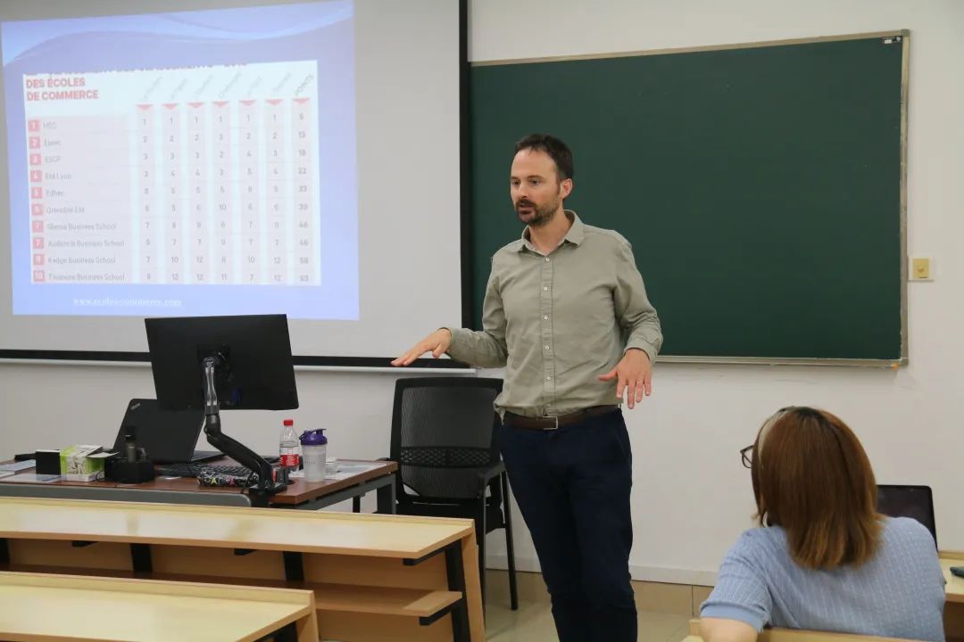 随后,Guillaume Duquenne先生为在座同学进一步介绍了法国商校提供的专业课程,如审计、金融、人力资源管理等,以及商校毕业生的就业前景。Guillaume Duquenne先生还表示很多知名法企高管都是商校出身,因此拥有在法国排名靠前商校的学习经历对于未来想要进入法企工作的同学而言优势较为明显。
