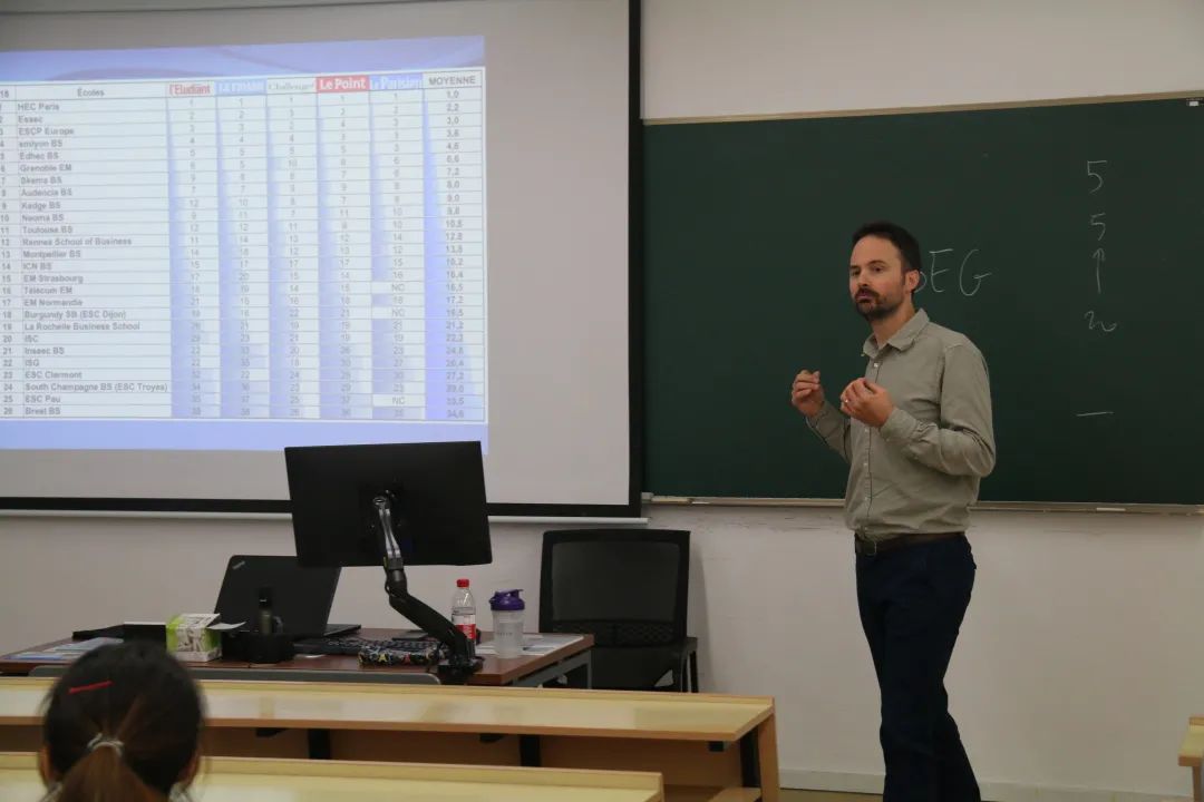首先,Guillaume Duquenne先生为大家展示了法国商校排名依据的特殊性,即法国商校由法国各权威报刊进行排名,并不具有唯一性。报刊排名的参考价值在于了解哪些是在法国受到广泛认可的顶尖商校,如HEC Paris (巴黎高等商学院)Essec (埃塞克高等商学院)ESCP Europe (欧洲高等商学院)等。接下来,Guillaume Duquenne先生为同学们讲解了商校和公立大学的区别:前者的教学更具国际化,大部分课程都是英文授课,且更注重培养学生的职业实践能力;后者的教学偏向理论化,实习要求较低。此外,Guillaume Duquenne先生还介绍了商校预备班的有关情况,其优势在于课程难度较低、前期准备较为轻松,且可以提供更多实习机会。