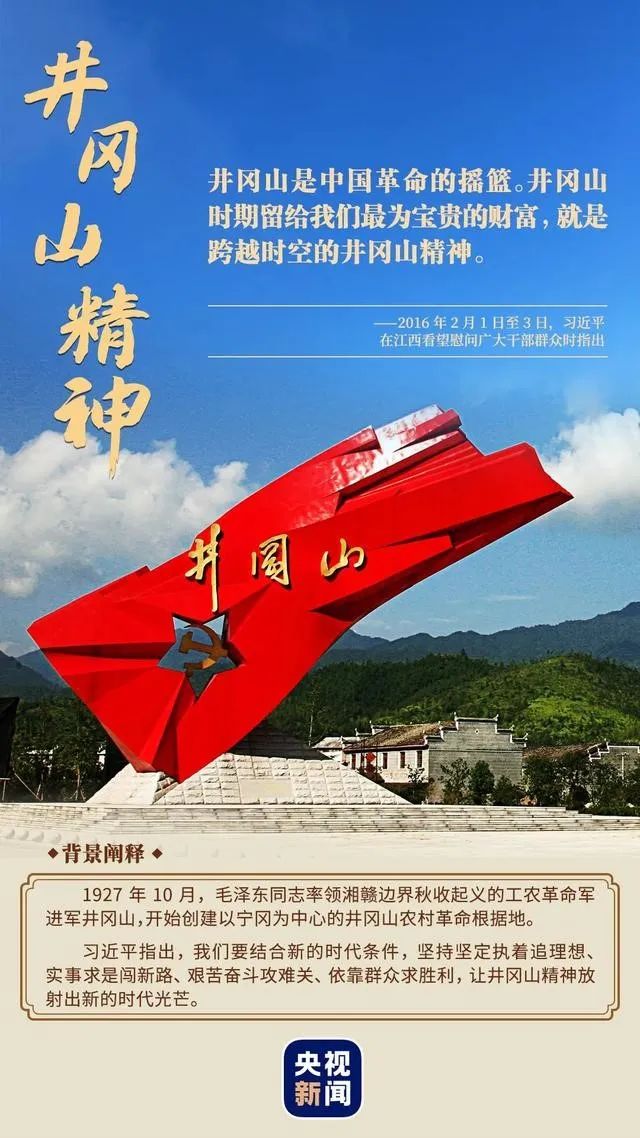 井冈山精神是以毛泽东同志为代表的中国共产党人在井冈山创建革命根据地、开辟中国革命新道路、进行艰苦卓绝的革命斗争中培育和形成的革命精神。今天,我们要结合新的时代条件,坚持坚定执着追理想、实事求是闯新路、艰苦奋斗攻难关、依靠群众求胜利,让井冈山精神放射出新的时代光芒。
