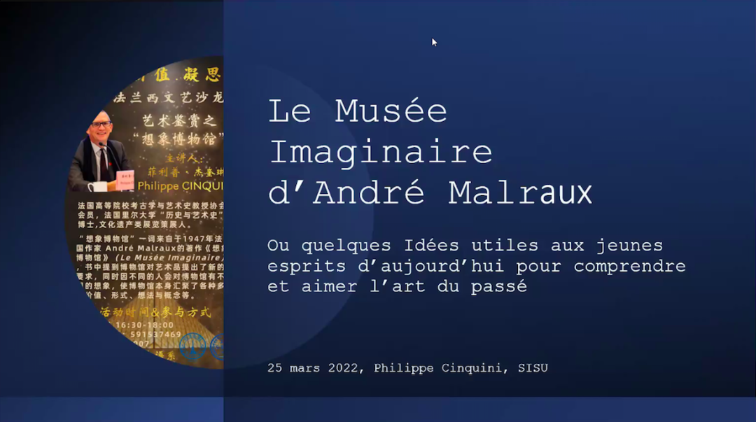3月25日,上海外国语大学法语系举办了“互动·价值·凝思——线上法兰西文艺沙龙系列活动暨研究生学术训练营”第二期学术讲座。本期活动的主讲人菲利普·杰奎琳先生(Philippe Cinquini)以“想象博物馆”为主题,带领学生们领略安德烈·马尔罗的艺术思想与法国文化魅力。
