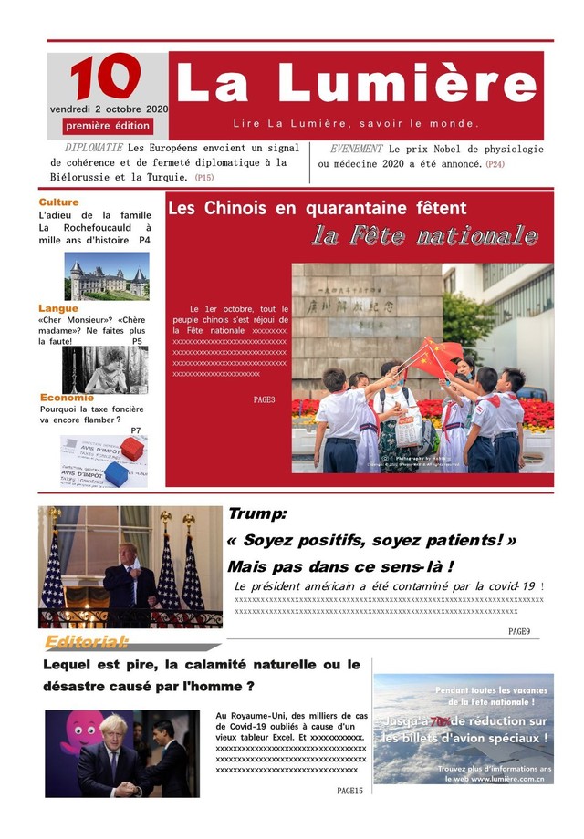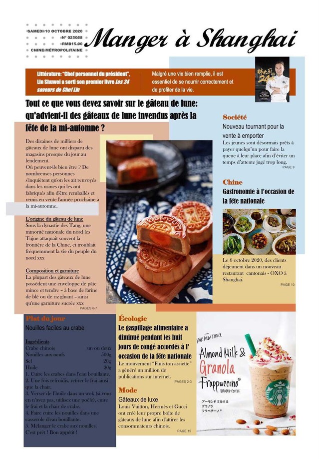 Enfin, pour concrétiser ce travail d’analyse par une activité plus créative, les étudiants ont, par groupes, créé eux aussi la Une d’un journal. Les étapes de ce projet étaient les suivantes : se tenir informé de l’actualité (chinoise et internationale) du 30 septembre au 13 octobre 2020 ; choisir un type de journal (généraliste, spécialisé, d’opinion, national, régional, gratuit, quotidien, hebdomadaire, etc.) ; sélectionner et hiérarchiser les informations les plus importantes (selon eux, le type de journal choisi et le lectorat visé) ; construire une Une cohérente et de la mettre en page (avec les rubriques, le titre et une dépêche contenant les informations principales mais sans article intégralement rédigé) ; et enfin présenter leur Une à la classe à l’oral en précisant et justifiant de leurs différents choix éditoriaux.