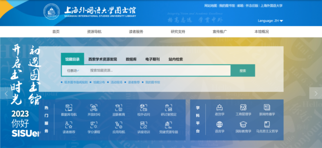 除了上述多种形式的线下课程、活动,学校也提供了丰富的电子资源。在校园网环境下登录上海外国语大学图书馆主页,选择数据库导航,就可以免费使用学校购买的数据库,通过内容、语种等分类检索所需资源,阅读和下载中外文电子期刊、电子书,轻松站在巨人肩膀上~