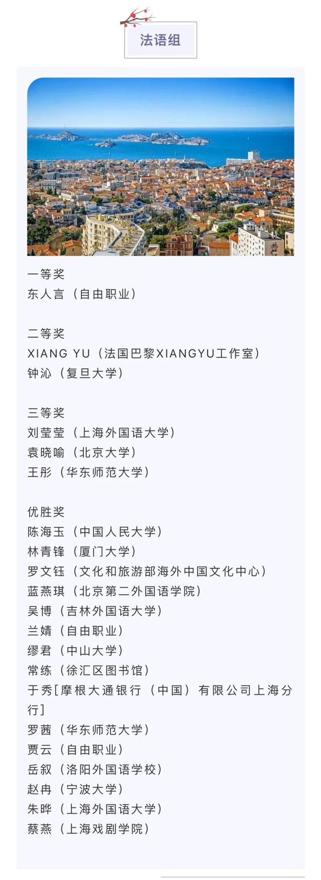 2023118日,第20上译杯翻译竞赛获奖名单公布,法语系教师刘莹莹老师、朱晔老师在本次竞赛中荣获法语组三等奖和优胜奖。上译杯是由上海市文学艺术界联合会、上海世纪出版(集团)有限公司主办,上海翻译家协会、上海译文出版社《外国文艺》杂志、上海话剧艺术中心承办,旨在推进我国翻译事业的繁荣发展、发现和培养翻译新人的专业赛事,现已成为翻译界备受认可的权威比赛,目前已经走过了二十个年头,具有极高的专业性,吸引了全球各地的顶尖翻译人才参与其中。