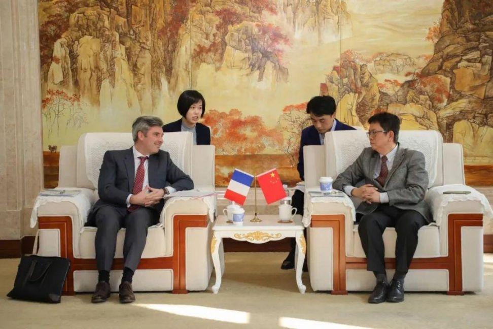 与学生互动交流后,总领事一行参观法语系并与王海洲主任进行了会谈。双方就法语专业人才培养、法语专业建设及进一步促进中法两国教育文化领域交流进行了沟通,并就共同举办法国企业见面会、组织中法建交60周年庆祝活动等达成意向。