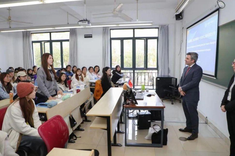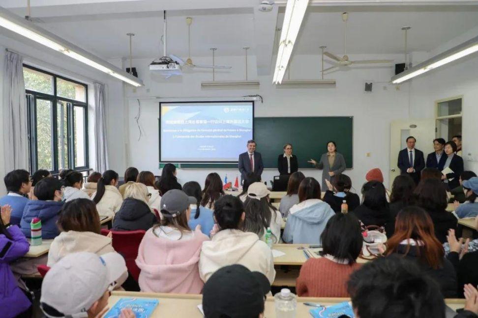 会晤结束后,总领事一行前往法语系,走进课堂与法语系一年级学生进行互动交流。王度总领事分享了自己的学习经历及职业生涯,勉励同学们在上外良好的学习环境及优质的培养体系下学好法语,在未来成为促进中法两国沟通交流的“使者”。