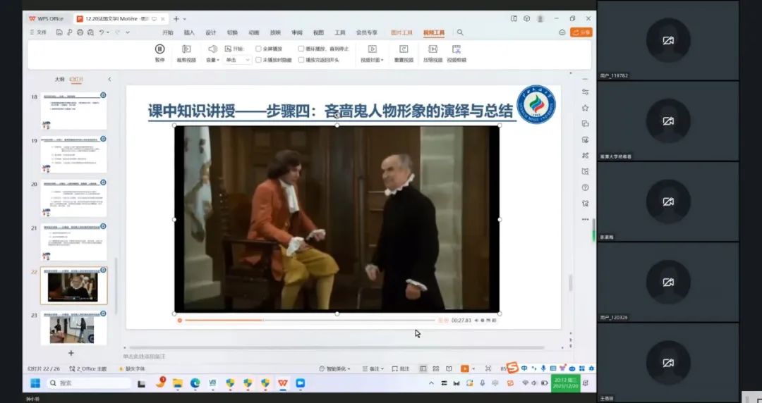 2023年12月20日晚上,由上海外国语大学法语系领衔的法语专业课程思政虚拟教研室举办了一次法语文学课程思政研讨会,来自广西民族大学、湘潭大学、上海对外经贸大学以及上海外国语大学等虚拟教研室成员单位的30余位法语教师相聚云端,共同探讨法语专业课程思政建设,本次教研活动由湘潭大学外国语学院副院长杨维春主持,湘潭大学王灵军老师和广西民族大学钟小铃老师作为主讲嘉宾,交流分享“法语文学”课程思政建设经验。