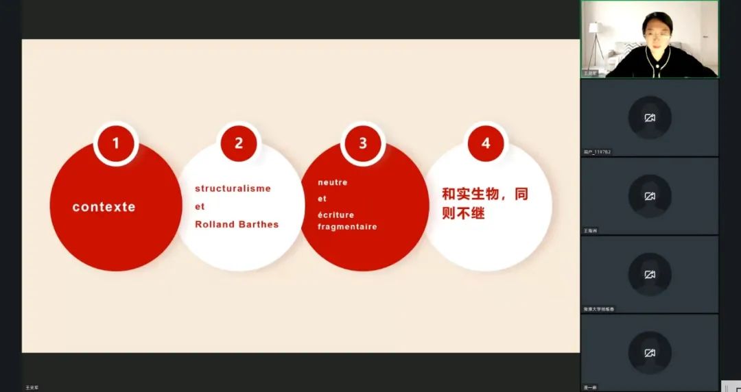 两位嘉宾分享完毕后,主持嘉宾进行了详细的点评,与会老师均认为,这两个思政课程教学案例展示了不同的思政内容融入“法语文学”教学的方式,有助于提升学生的文学素养和思辨能力,同时培养了学生的家国情怀和文化自信。这次研讨会为全国法语教师提供了有益的借鉴,期望法语专业课程思政虚拟教研室在未来的工作中继续发挥积极作用,促使全国法语教师互相学习,互通有无,共同探索出更多紧跟时代的课程思政与语言教学完美融合的方式,培养全面发展的社会主义建设者和可靠接班人。