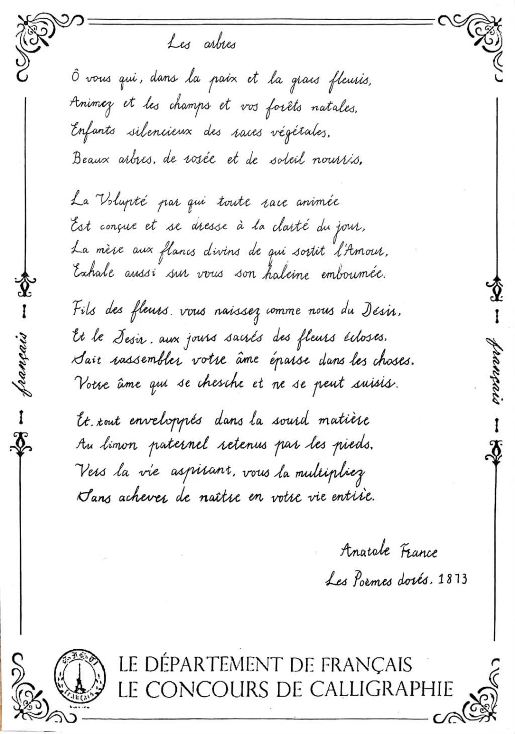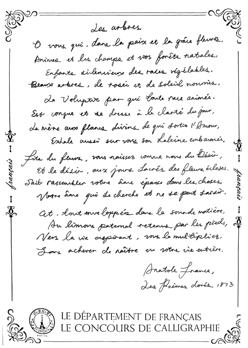 在本次法语书写大赛中,共计收到投稿61份,其中,14幅作品脱颖而出,进入决赛。经过法语系专业教师评审,参考网络投票结果,最终评选出6份获奖作品。