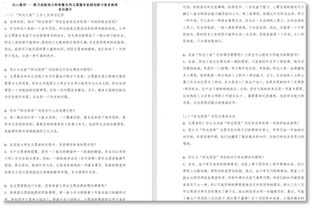为了解智力障碍群体的实际需要,该团队搜集了大量特殊教育、智力障碍群体的相关资料,制作了相关的调查问卷,走访了上海市松江区泗泾镇阳光之家、上海市松江区中山阳光之家及各成员家乡的残疾人之家,共产出1份问卷调查报告、2份采访报告和3份实地调研报告。