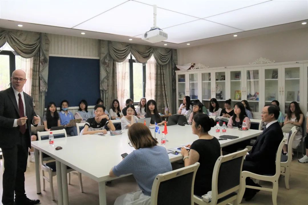 会晤结束后,孔以恒先生为法语系师生带来了主题为“从音乐看魁北克社会演变”的专题讲座。本次讲座系2021年跨文化视角下的法语语言、文学及文化研究系列讲座第八讲,也是魁北克研究中心年度活动之一。讲座由法语系副主任王蓓丽主持,法语系主任王海洲及法语系外事秘书葛丽君出席本次讲座。