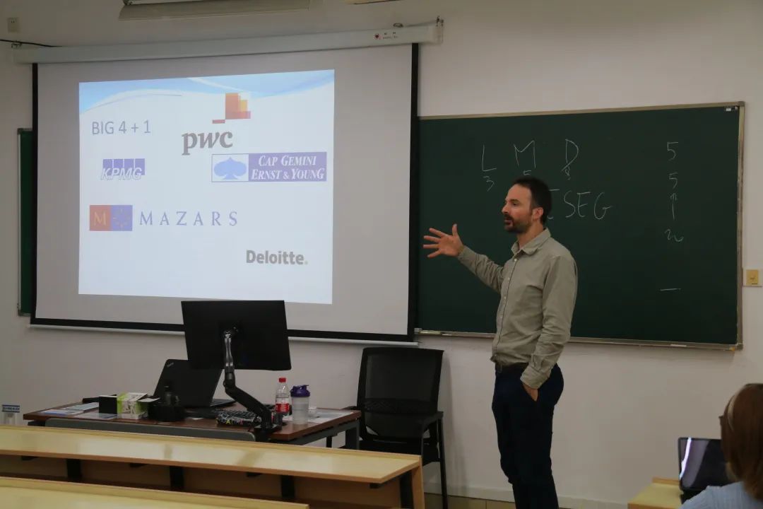 随后,Guillaume Duquenne先生为在座同学进一步介绍了法国商校提供的专业课程,如审计、金融、人力资源管理等,以及商校毕业生的就业前景。Guillaume Duquenne先生还表示很多知名法企高管都是商校出身,因此拥有在法国排名靠前商校的学习经历对于未来想要进入法企工作的同学而言优势较为明显。