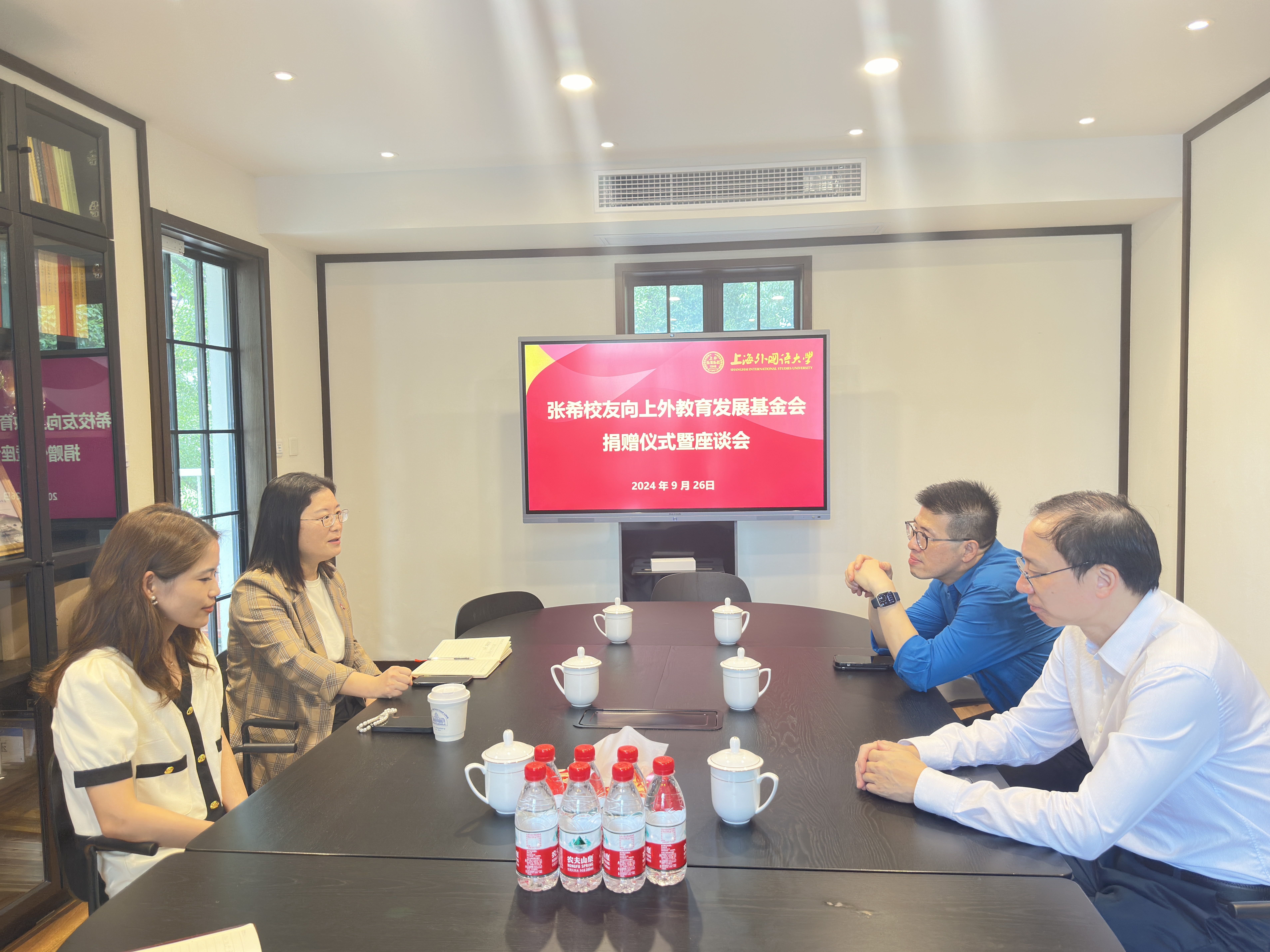 9月26日下午,上外法语系优秀校友捐赠仪式在虹口校友中心二楼会议室举行。法语系2008级校友张希向上外教育发展基金会进行捐赠,用于表彰资助综合能力卓越、综合素质优秀的法语系学子以及支持学校部分设施更新。法语系主任王海洲、系党委书记忻炯俊、校教育发展基金会/校友会秘书长王会花、副秘书长赵牧出席仪式并与校友进行亲切会谈。