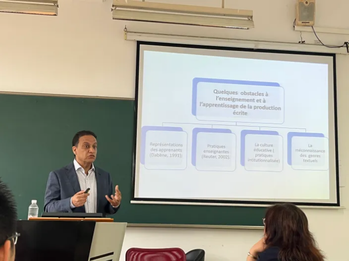首场沙龙中,Lahcen Elghazi教授介绍了魁北克大学的写作和论证教学。首先,Elghazi教授谈到,在教学过程中应考虑学生不同的文化背景,帮助学生适应新的教育方式,培养学生的自信心。其次,他指出了写作专家和新手的区别:专家动笔前会制定写作计划(planification),使得写作过程(mise en texte)迅速流畅,写完后会认真检查(révision);而新手则是草率下笔,导致准备不充足并感到行文困难。最后,教授强调写作者在论证中需要注意使用逻辑(logos)说服读者,用情感(pathos)打动读者,用教师、专家等身份(ethos)增加言论的可信度。教授的发言不仅让在场研究生掌握了更多提高写作与论证水平的技巧,也让同学们初步了解教学中面对不同文化背景的学生时会遇到的挑战与应对方法。