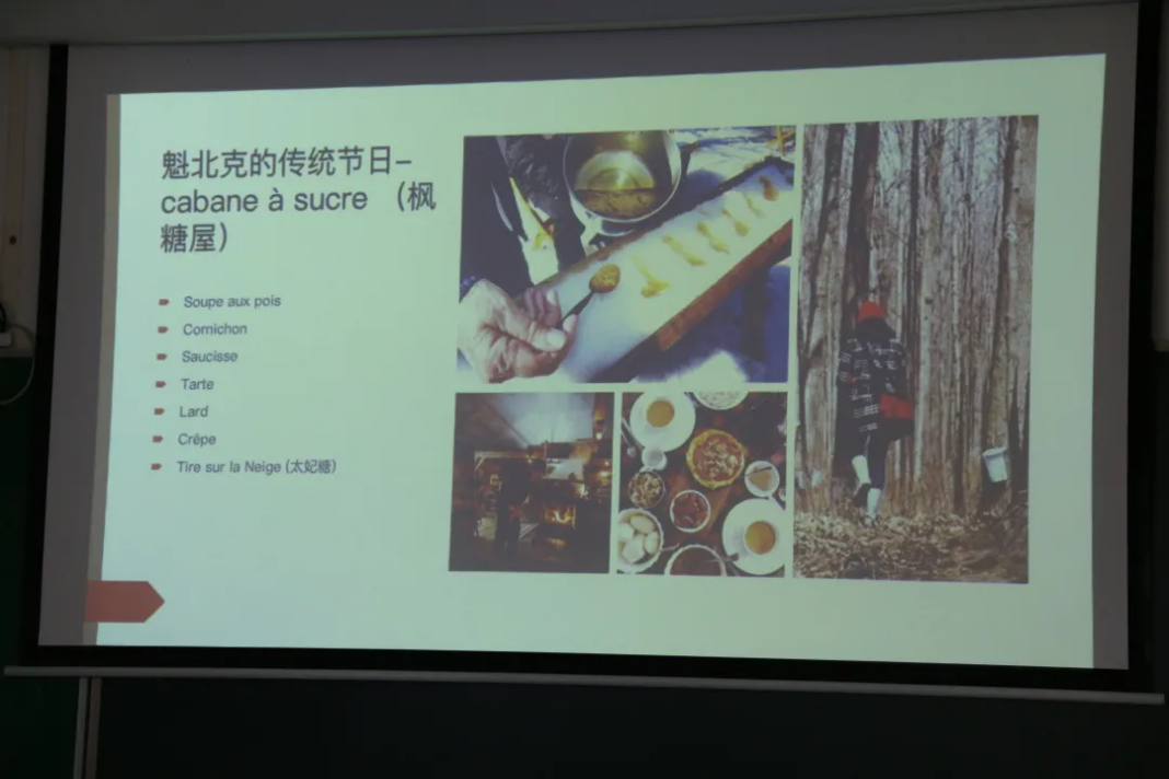第一场讲座通过介绍魁北克的地理风貌、风土人情、历史文化走进魁北克。首先,孙敏老师带领同学们畅游风景如画的魁北克城:立体壁画展现了魁北克的建设历史和重要人物;网红打卡地芳提娜城堡酒店(Château Frontenac)如同梦幻世界;四季变换的枫叶林令人心生向往。接着,孙敏老师讲述了魁北克地区建设初期的往事,介绍了许多对魁北克历史有着重要影响的人物。同时,老师提到了坐落于魁北克圣劳伦斯河北岸的加拿大原住民家园。随后,老师介绍了魁北克(Québec)名字的由来,以及其历史上的名称变化。最后,老师将视角转向美食文化,介绍了魁北克美食以及当地特有的枫糖吃法,视听结合,生动有趣。