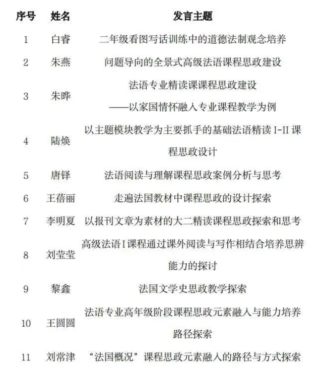 在会议上,白睿、朱燕、朱晔、陆焕、唐铎、王蓓丽、李明夏、刘莹莹、黎鑫、王圆圆、刘常津等11位法语系教师分别进行了主题发言。