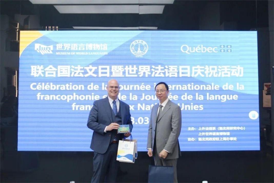 随后,孔令涛副馆长与孔以恒主任分别代表上外世界语言博物馆与魁北克政府驻上海办事处互赠礼物并合影留念。