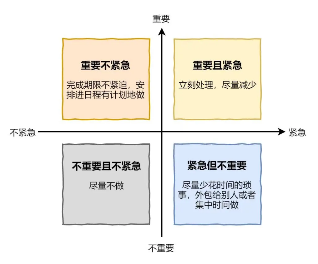 当我们在收到一系列任务,却无从下手时,可以先对事情的轻重缓急作出分析,分析标准参考下图 :