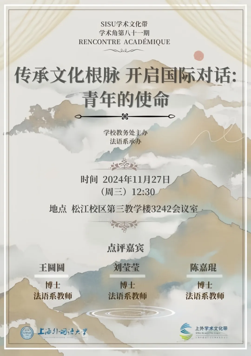 作为“SISU学术文化带”系列活动之一,学术角活动集专业性、前沿性、创新性于一体,致力于培养学术志趣、拓展学术视野、打造交流平台、营造互动氛围、提升人才质量。本期SISU学术角以“传承文化根脉,开启国际对话:青年的使命”为主题,由教务处主办、由法语系承办,将于2024年11月27日12:30准时开启!本期活动将由法语系四年级九名同学分享其近期在学术上的思索与研究成果,邀请王圆圆老师、刘莹莹老师和陈嘉琨老师担任嘉宾点评,旨在培养同学们的思辨能力与学术能力,进一步培育院系学生学术氛围。