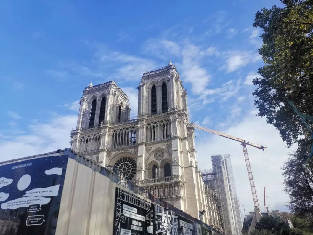 当时的巴黎圣母院尚未修复,建筑背后还耸立着高大的塔吊。