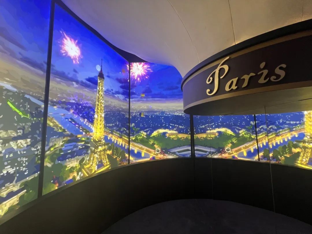 展览入口化身复古火车,仿佛穿越巴黎东站。从2D黑白巴黎到虚拟世界,乘坐热气球、齐柏林飞艇,登上埃菲尔铁塔顶峰,自由飞行俯瞰巴黎全景,每一帧都是浪漫大片。