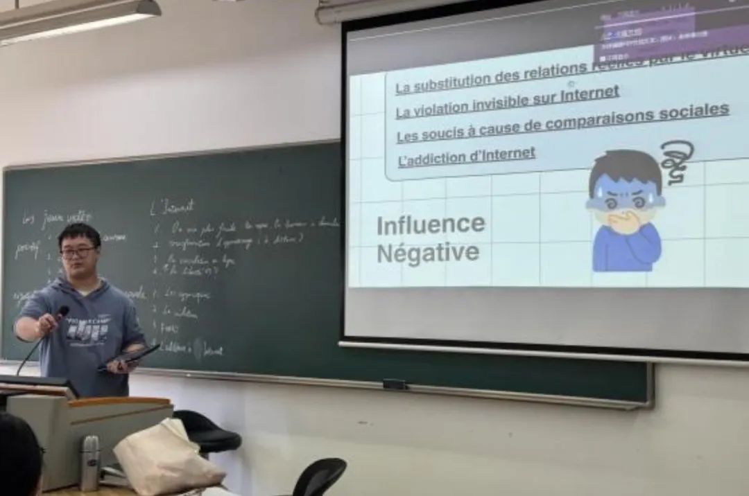 最后,白睿老师带领同学们观看了 “游戏障碍”法语科普视频,结合教学提炼了相关术语,并针对视频内容与学生展开讨论。学生们谈到,网络和游戏本身没有好坏属性,个体应加强自我管理,理性看待技术进步,构建健康生活方式。
